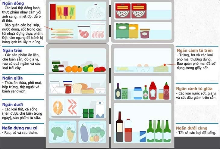- Đối với ngăn mát: Bạn sử dụng cánh cửa tủ để đặt các thực phẩm khô hay các gia vị nấu nướng, đồ uống. Bạn hãy đặt thực phẩm ăn liền, đồ chín lên phía trên còn đồ tươi sống phía dưới, rau củ quả có ngăn riêng biệt để bảo quản tươi ngon, mọng nước hơn.