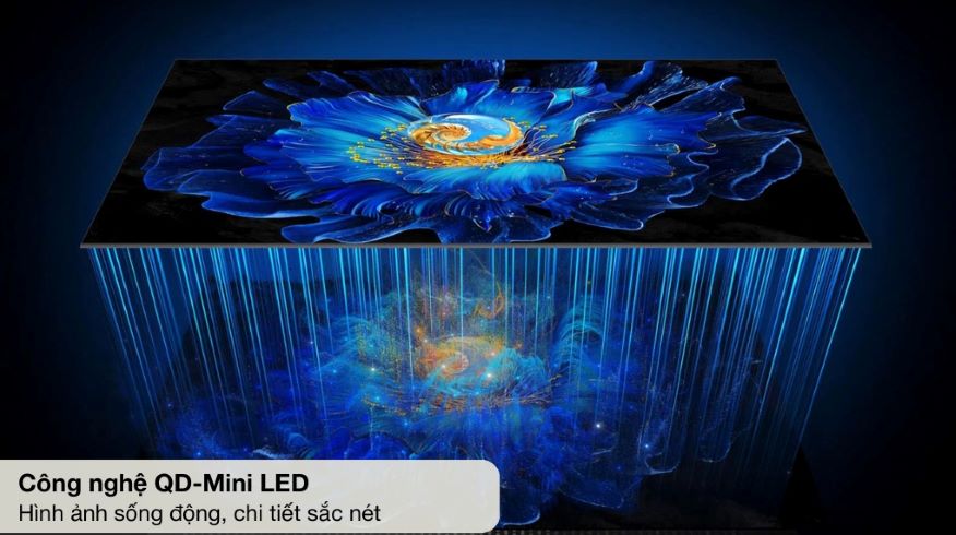 - Màn hình QD-Mini LED 4K tích hợp công nghệ Quantum Dot và đèn nền Mini LED giúp tăng cường độ sáng, cải thiện độ tương phản và tái tạo màu sắc chính xác, mang đến hình ảnh sống động và chân thực trong mọi điều kiện ánh sáng.
