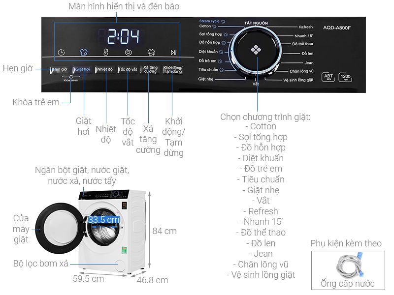 Thông số kỹ thuật Máy giặt Aqua Inverter 8 KG AQD-A800F W