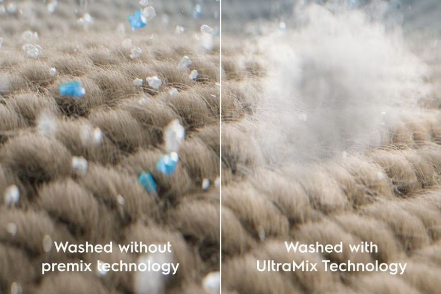 Với công nghệ UltraMix, chất giặt tẩy và chất làm mềm vải được hòa tan hoàn toàn và sẵn sàng phát huy đầy đủ tác dụng trước khi đi vào lồng giặt, đảm bảo quần áo của bạn được giặt sạch mà không dính vết cặn chất giặt tẩy.*