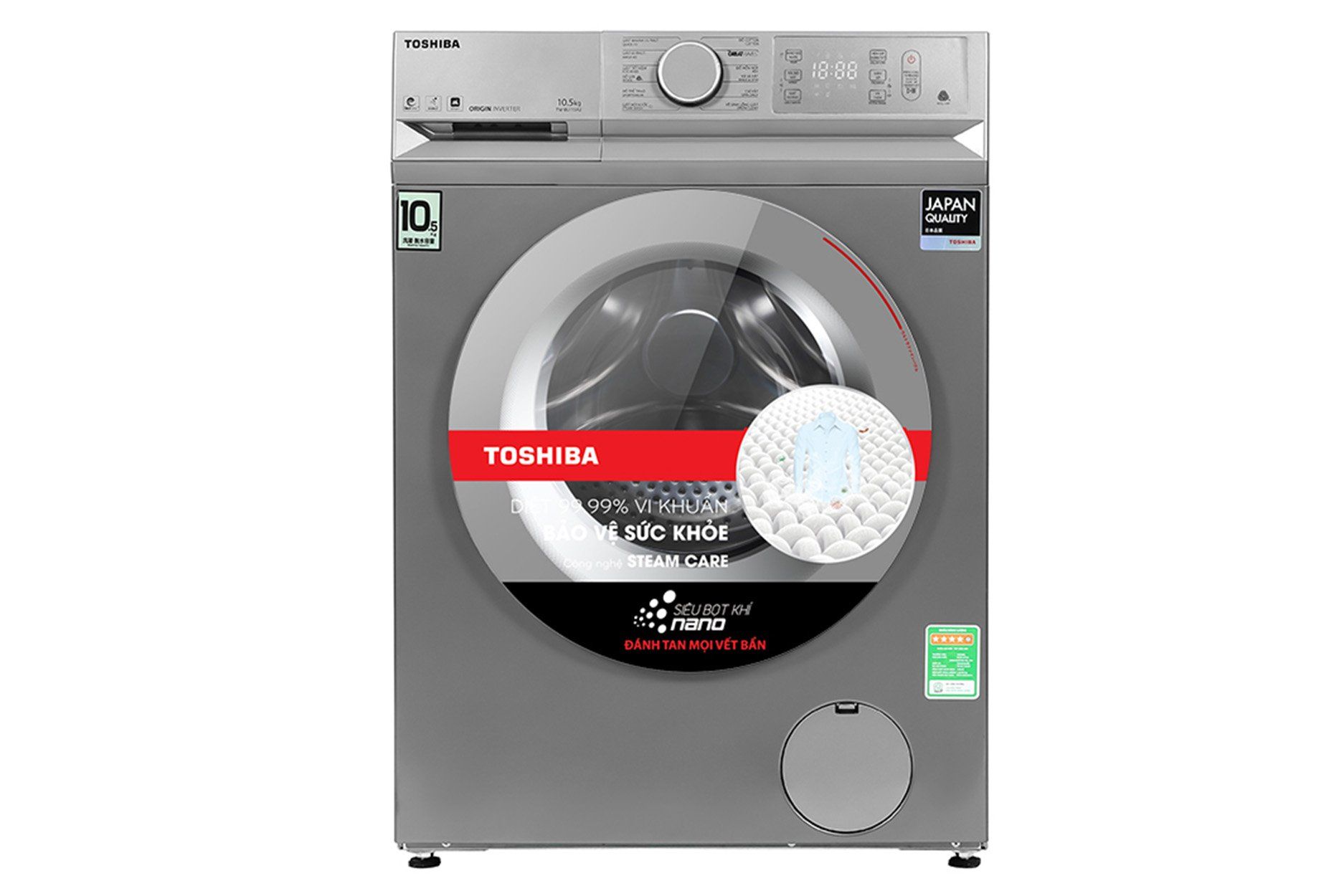Máy giặt Toshiba 10.5 kg TW-BL115A2V(SS) có kiểu dáng hiện đại, tích hợp công nghệ giặt Greatwaves siêu sóng quét bay mọi vết bẩn cứng đầu, có 12 chương trình giặt cài đặt sẵn, tăng hiệu suất sử dụng và giặt tẩy với công nghệ UFB siêu bọt khí NANO, Steam Wash, Origin Inverter, động cơ nam châm vĩnh cửu, dễ dàng điều khiển qua điện thoại, tiện dụng trong gia đình Việt.