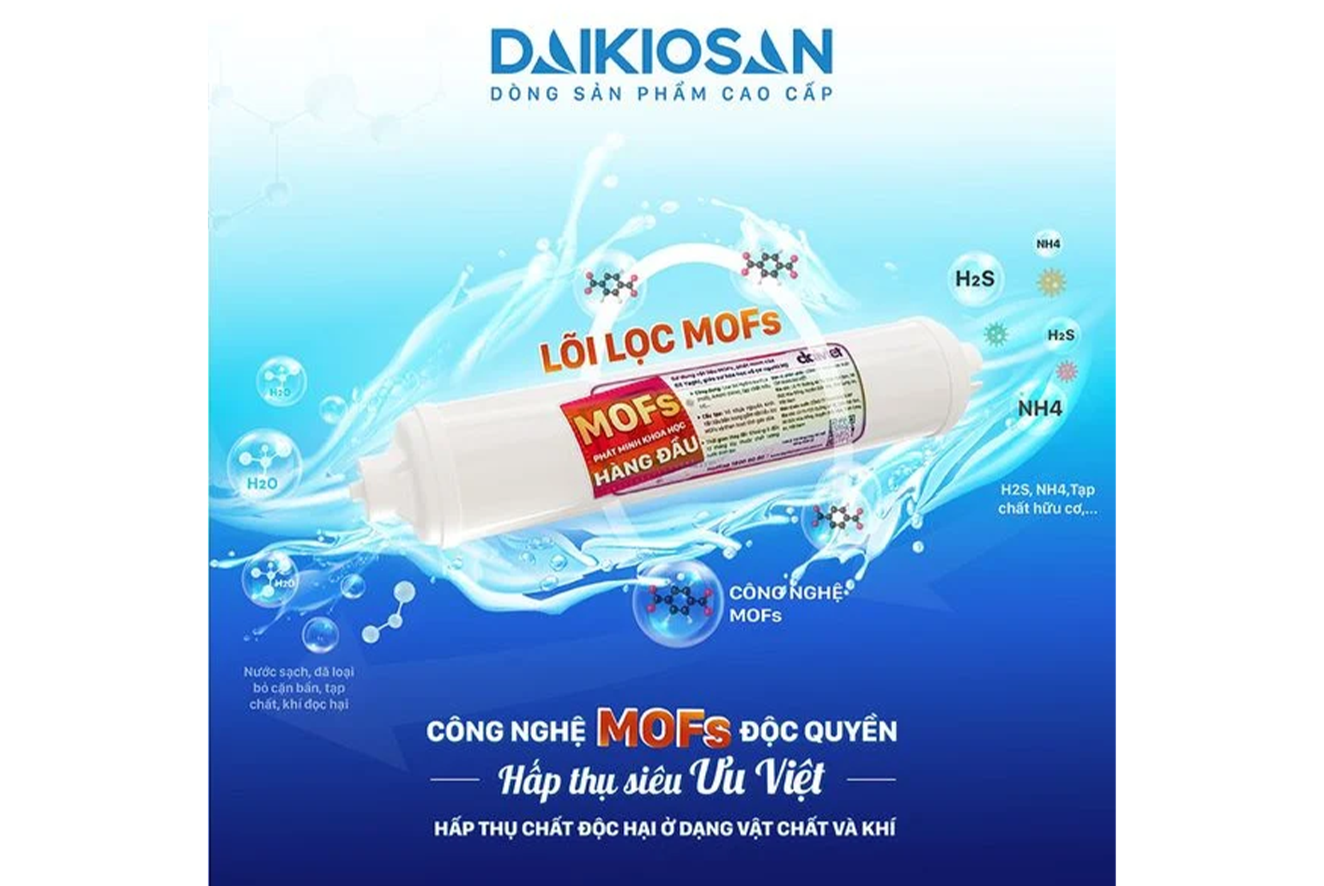 Đây là một bước đột phá mới trong công nghệ của Daikiosan, bằng cách sử dụng công nghệ MOFs - phát minh khoa học hàng đầu của Giáo sư Yaghi. Thông qua ứng dụng công nghệ này, Máy lọc nước nóng nguội lạnh Daikiosan DR-H DN301 có khả năng hiệu quả hấp thụ các chất như NH3 (AMONI) và NH4 (AMONIAC) - những tác nhân gây ô nhiễm trong nước. Điều quan trọng là công nghệ này giúp ngăn ngừa các yếu tố có thể gây bệnh ung thư, đồng thời loại bỏ mùi khai, hôi, và Clo tồn dư, đảm bảo rằng nước uống luôn tinh khiết và an toàn cho sức khỏe của bạn và gia đình.