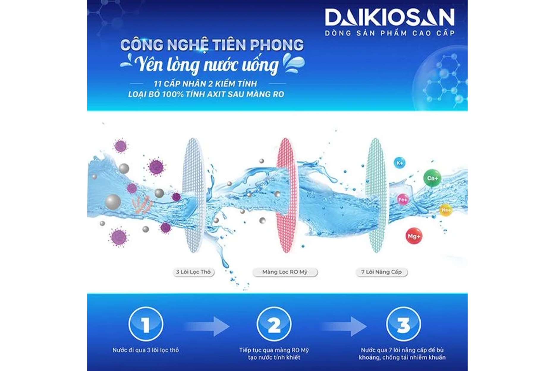 Hệ thống lọc tiên tiến với 11 cấp và 2 nâng cấp kiềm đột phá đã cải thiện hiệu suất của Máy lọc nước nóng nguội lạnh Daikiosan DN301 giúp loại bỏ hoàn toàn tính axit trong nước sau màng lọc RO. Không chỉ đảm bảo sức khỏe cho gia đình bạn, mà còn giúp giảm thiểu tác động oxy hóa, tạo ra các ion kiềm, và nâng cao độ pH của nước từ mức 8 lên đến 9,5 (±0,5), qua đó đem lại rất nhiều lợi ích cho sức khỏe như: Cân bằng pH cho cơ thể, giảm tác độc oxy hóa, tăng cường đề kháng,...