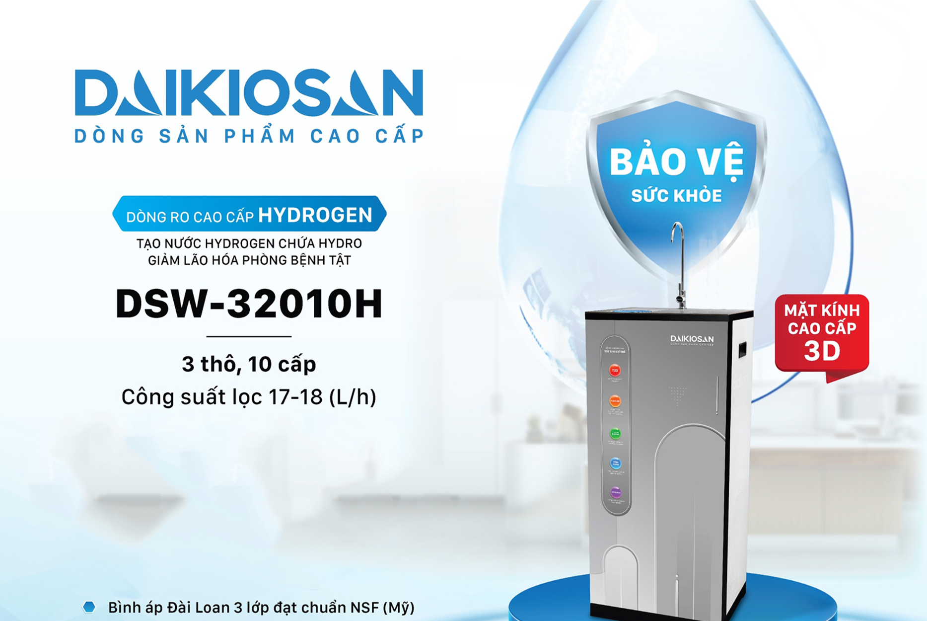 Máy lọc nước RO Hydrogen Daikiosan DSW-32010H không chỉ cung cấp nguồn nước sạch mà còn giàu hydrogen - Nguồn nước khỏe, hỗ trợ giảm thiểu lão hóa, bệnh tật, làm đẹp cho da...