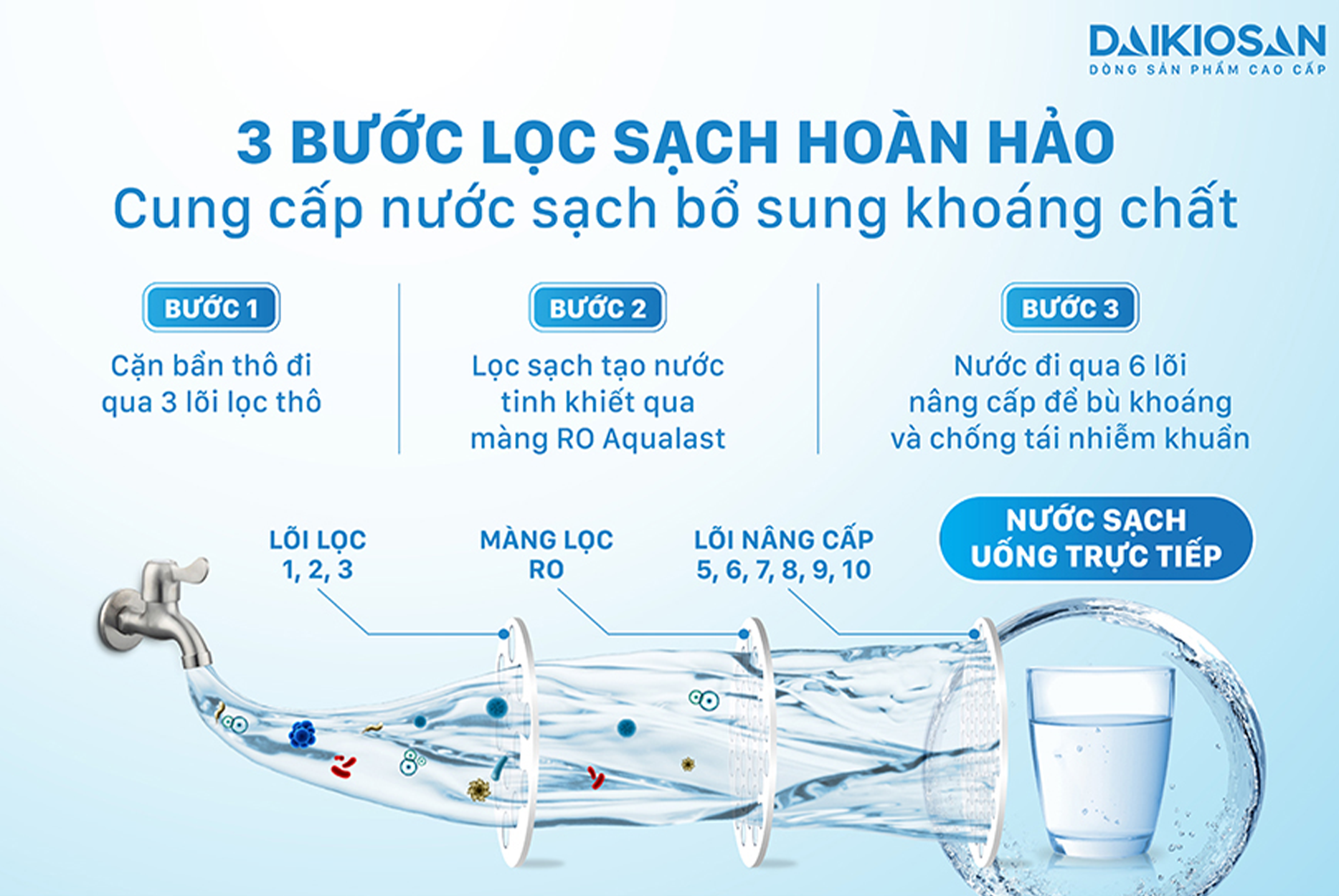 Mẫu nước ăn uống trực tiếp sau khi qua hệ thống lọc của máy lọc nước RO nhãn hiệu Daikiosan có tác chỉ tiêu phù hợp với QCVN 01:2009/BYT: Quy chuẩn kỹ thuật quốc gia về chất lượng nước ăn uống và QCVN 6-1:2010/BYT: Quy chuẩn kỹ thuật quốc gia đối với nước uống đóng chai (uống trực tiếp) do Bộ Y tế ban hành.