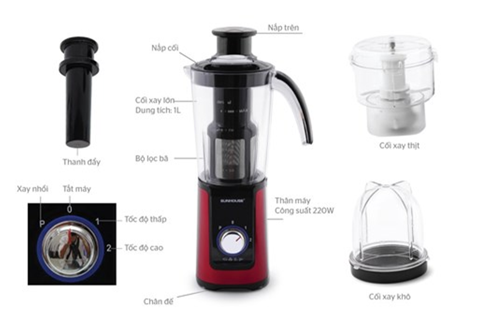 Máy xay sinh tố Sunhouse SHD 5322 được trang bị cối xay sinh tố kèm lưới lọc bã và 1 thanh đẩy giúp bạn xay trái cây được nhanh hơn. 1 cối xay thực phẩm khô và 1 cối xay thịt, đáp ứng mọi nhu cầu làm bếp của bạn.