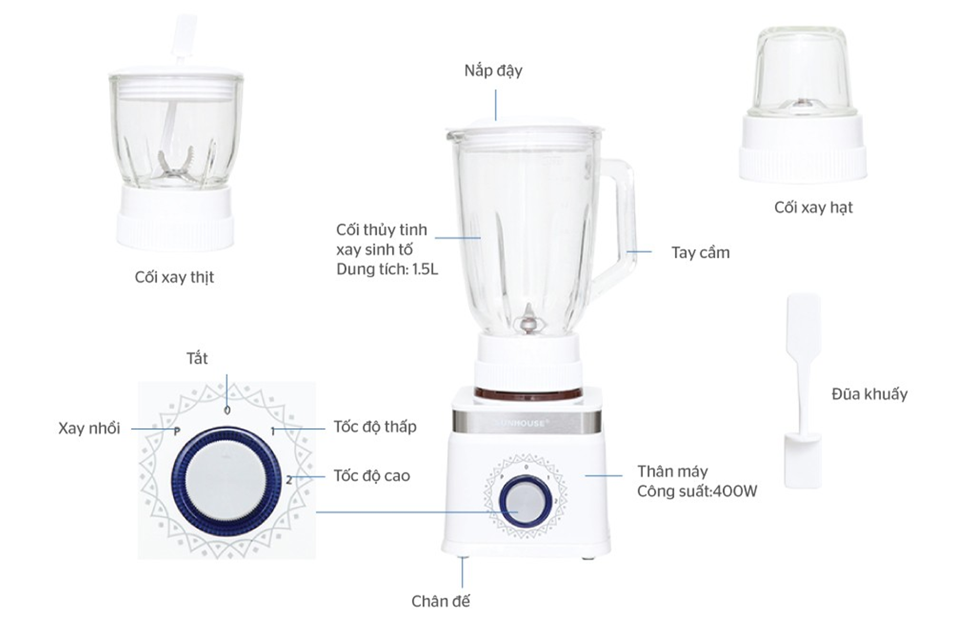 Máy xay sinh tố Sunhouse màu trắng trang nhã, sang trọng, kiểu dáng hiện đại, hài hòa trong không gian sử dụng của mọi gia đình