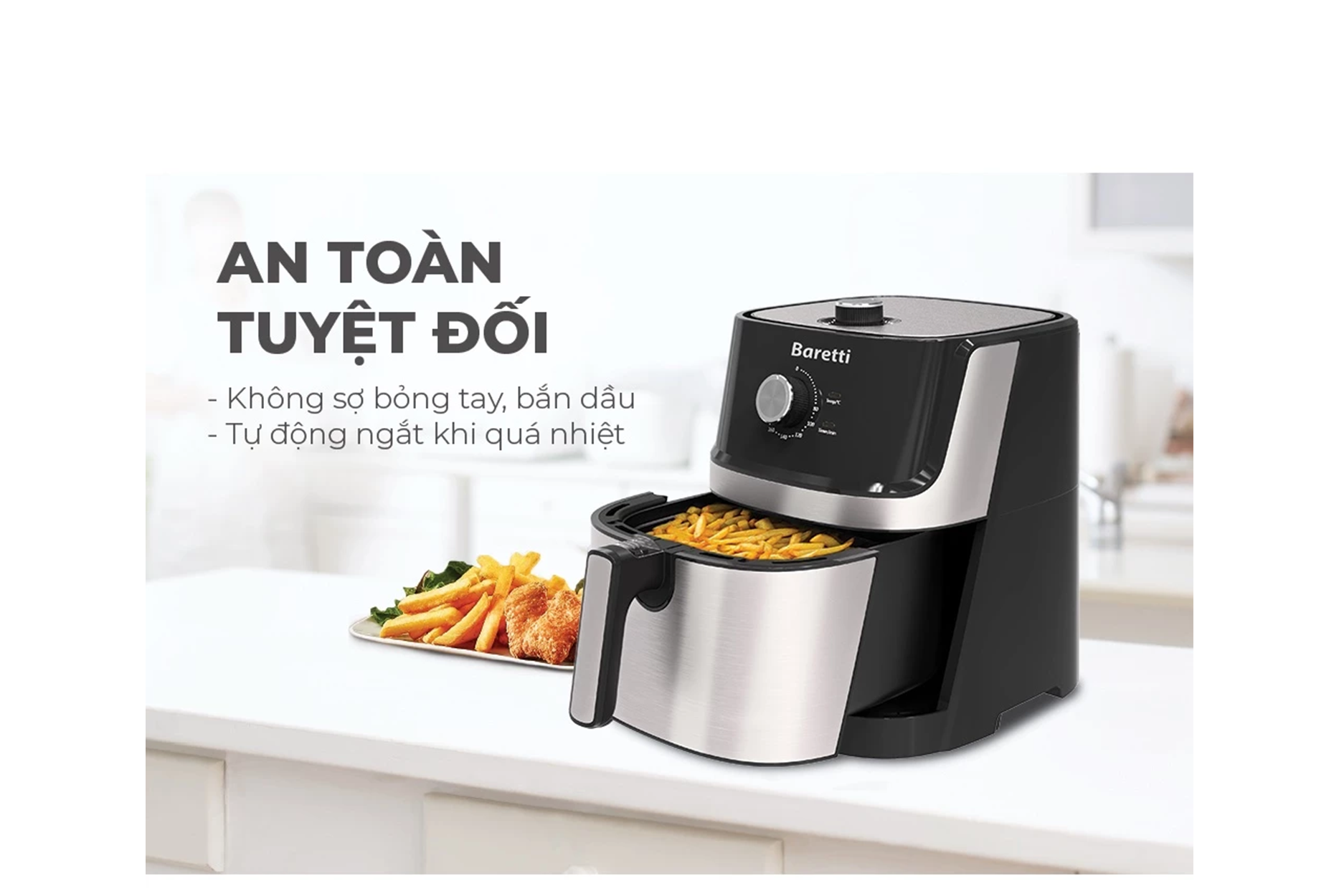 Để đảm bảo an toàn cho người sử dụng, nồi chiên không dầu Baretti còn được trang bị thêm tính năng Tự động ngắt khi quá nhiệt, phòng tránh các nguy cơ cháy nổ, chập điện khi người dùng quên hoặc mải bận rộn công việc khác trong khi nấu ăn.
