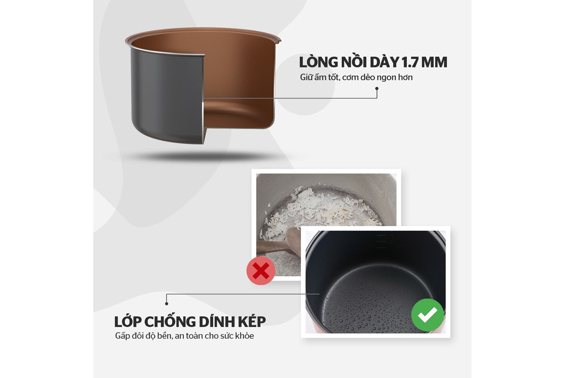 - Thiết kế lòng nồi nhôm dày 1.7mm giúp truyền nhiệt tốt, giữ ấm lâu, cơm nấu ra được dẻo hơn, thơm ngon hơn. Đặc biệt, lòng nồi được phủ lớp chống dính kép, tăng gấp đôi độ bền, hạn chế bám dính cơm vào lòng nồi.