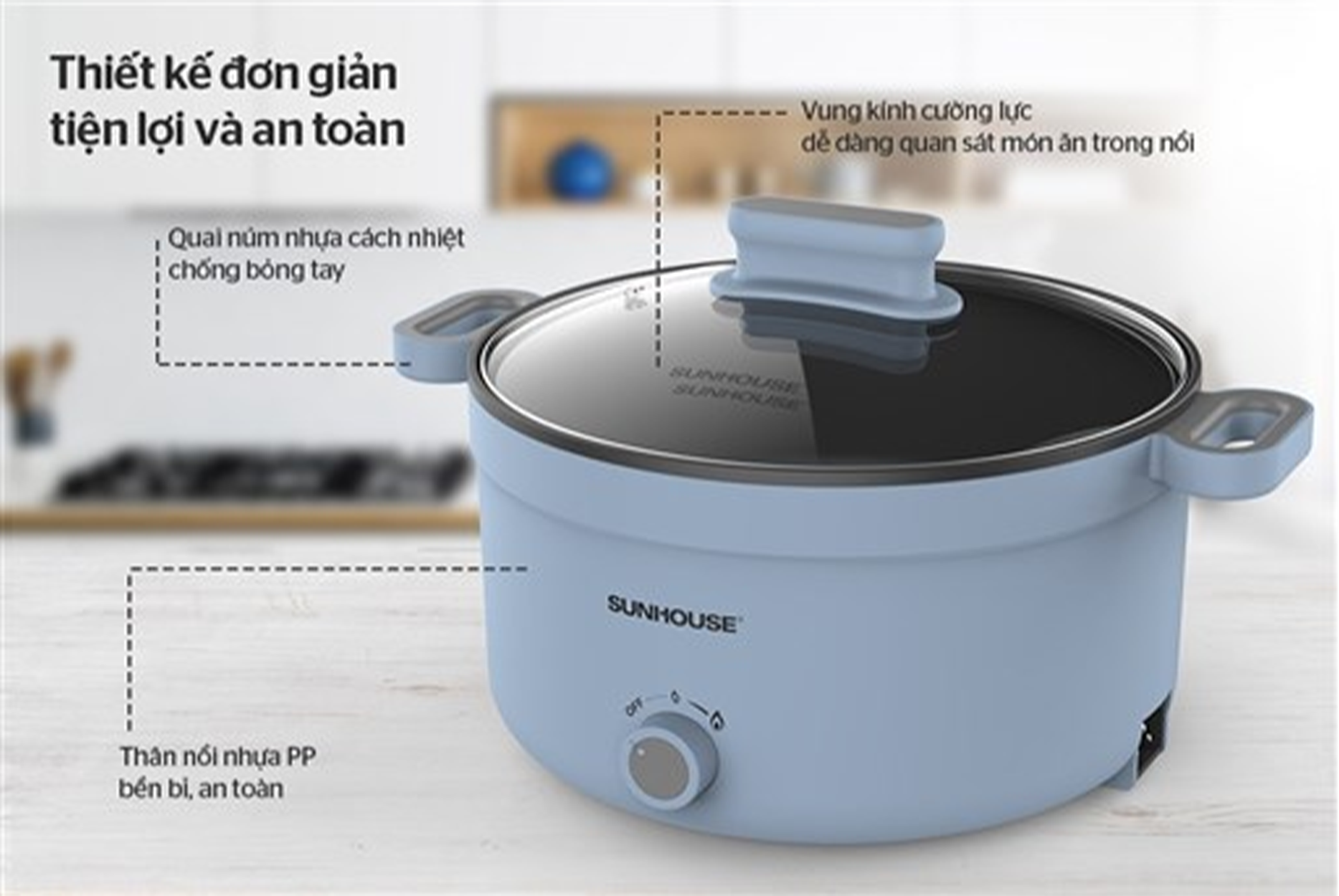 Nồi lẩu điện 3.5L SUNHOUSE SHD4528 có thân nồi làm từ chất liệu nhựa PP cao cấp, bền bỉ, có khả năng chịu nhiệt cao. Đây cũng là chất liệu giúp hạn chế gây bỏng khi tiếp xúc với nồi, an toàn khi sử dụng. Gam màu xanh pastel trendy, lạ mắt, điểm nhấn thời thượng cho căn bếp gia đình.