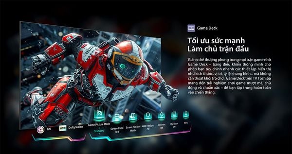 Game Deck là một tính năng được Toshiba tích hợp trên tivi để tối ưu hóa trải nghiệm chơi game. Với Game Deck, người chơi sẽ có một bảng điều khiển tiện lợi, cho phép điều chỉnh nhanh các thiết lập hiển thị như kích thước, vị trí và tỷ lệ khung hình mà không cần phải thoát khỏi trò chơi.