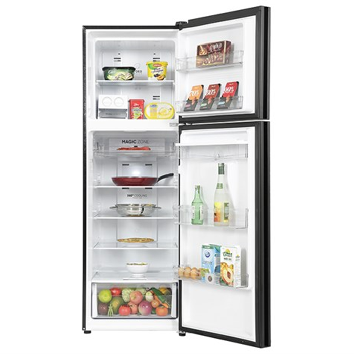 - Ngăn lạnh có dung tích 256 lít, gồm có 1 ngăn đông mềm Magic Zone, 3 kệ chia làm 4 ngăn và 1 ngăn rau củ quả. Ngoài ra, bên cánh cửa tủ còn được thiết kế 1 ngăn đựng nước và 2 khay chứa.