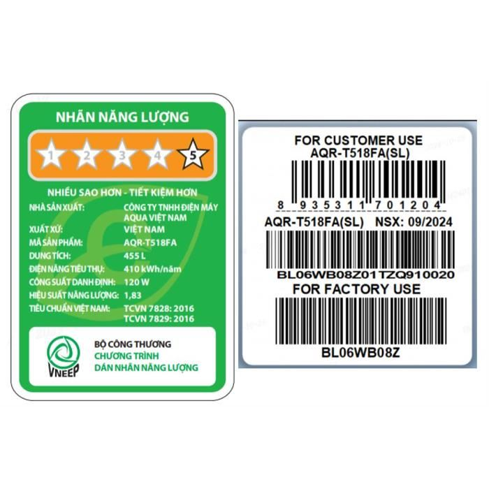 Công suất tiêu thụ công bố theo TCVN:410 kWh/năm