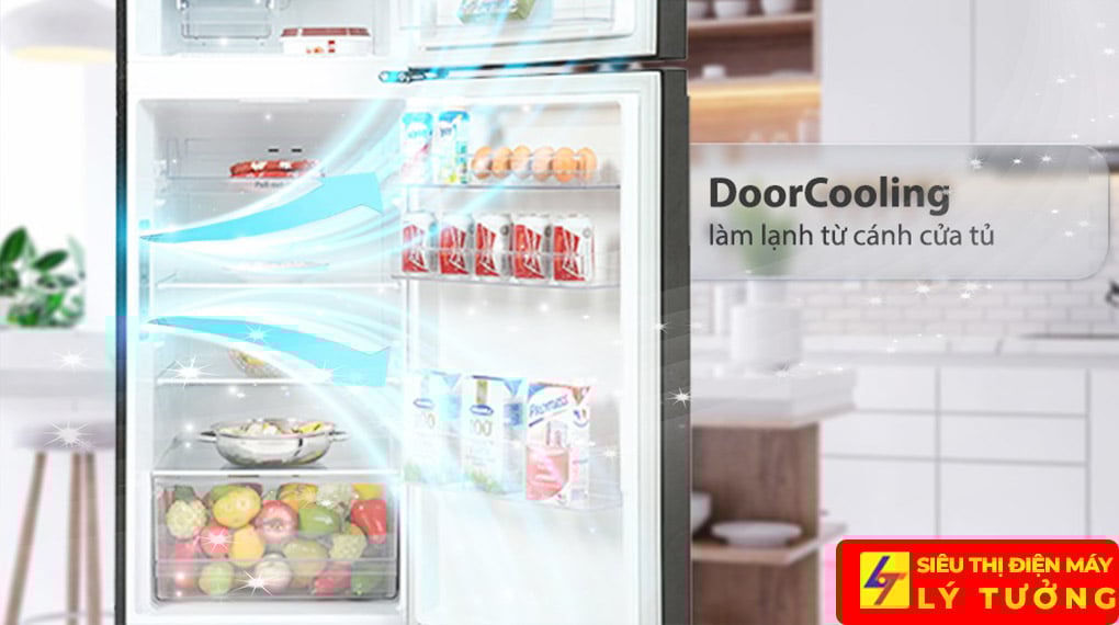 - Công nghệ Door Cooling hơi lạnh được thổi ra từ cánh cửa tủ nhờ đó khí lạnh tỏa đều đến mọi vị trí trong tủ giúp thực phẩm được bảo quản tốt hơn.