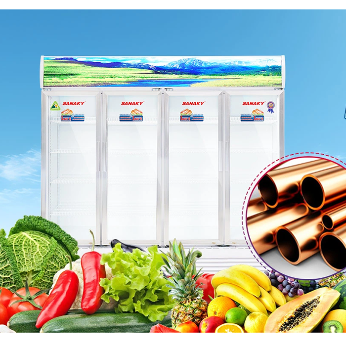 Với dàn lạnh được làm từ chất liệu đồng có độ bền cao hơn so với dàn lạnh nhôm và khả năng vận hành êm ái, làm lạnh nhanh chóng hơn giúp nước uống, trái cây, rau củ quả được ướt lạnh. Dàn lạnh bằng đồng cho hiệu suất làm lạnh nhanh và bền bỉ hơn so với dàn nhôm.